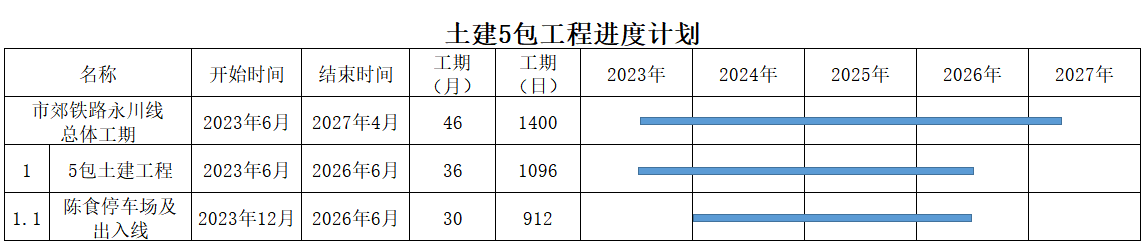 市郊鐵路重慶中心城區(qū)至永川線工程計(jì)劃施工總工期60個(gè)月。本招標(biāo)項(xiàng)目計(jì)劃于2023年6月30日開工,計(jì)劃1096日歷天按合同約定實(shí)施和完成本承包工程。